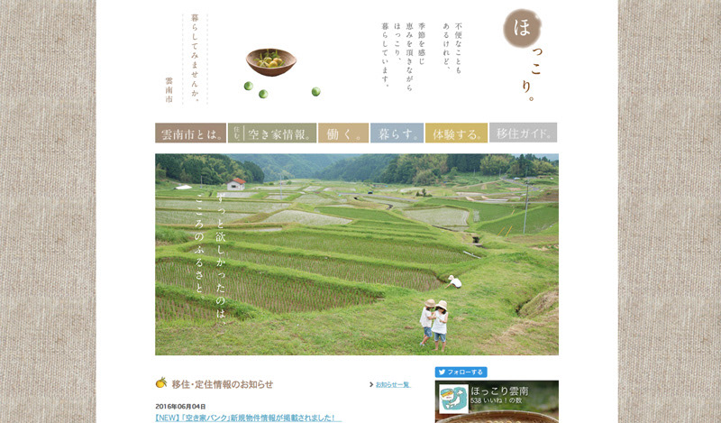 雲南市の定住サイトです。空き家検索や市営住宅の紹介のほか、UIターンされた方へのインタビューもあり、